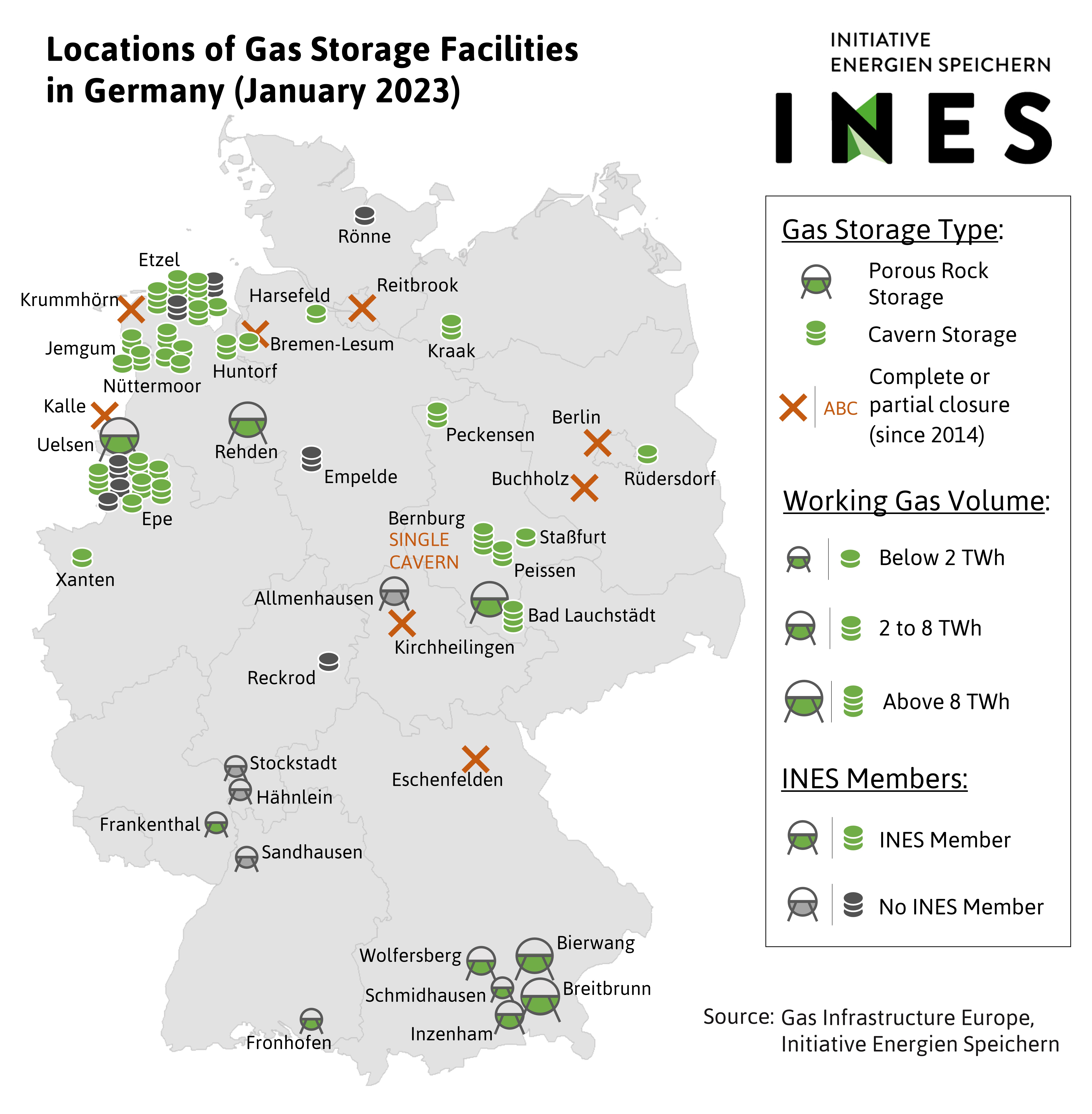 The map gives an overview of where gas storage facilities can be found in Germany: