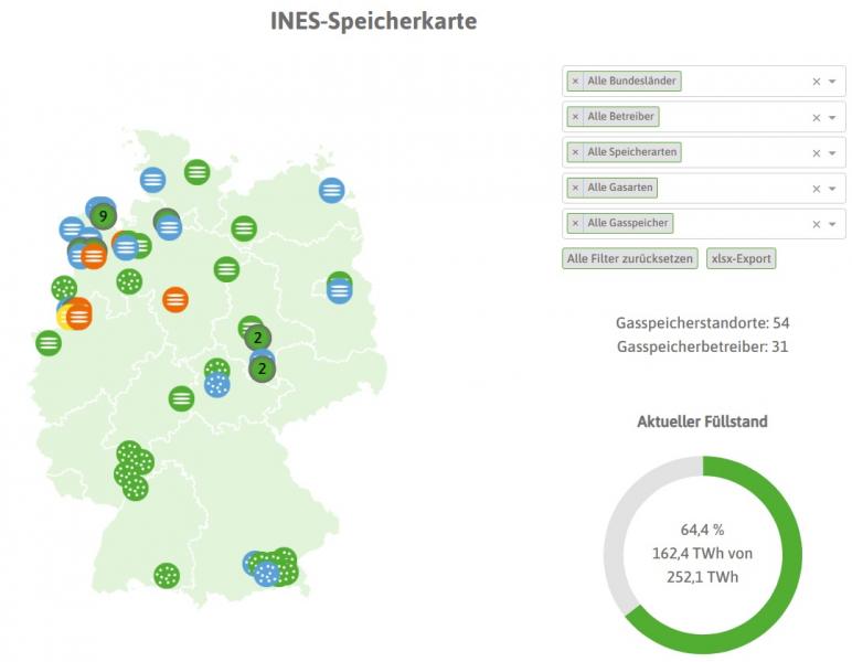 Für jede Filterung werden die Anzahl der Gasspeicherstandorte, die Anzahl der Gasspeicherbetreiber und der aktuelle Füllstand der Gasspeicher angezeigt. Zudem können individuelle Füllstände und weitere Informationen über jeden Einzelspeicher abgerufen werden. Per Mausklick steht dabei auch ein Download als Excel-Datei zur Verfügung.