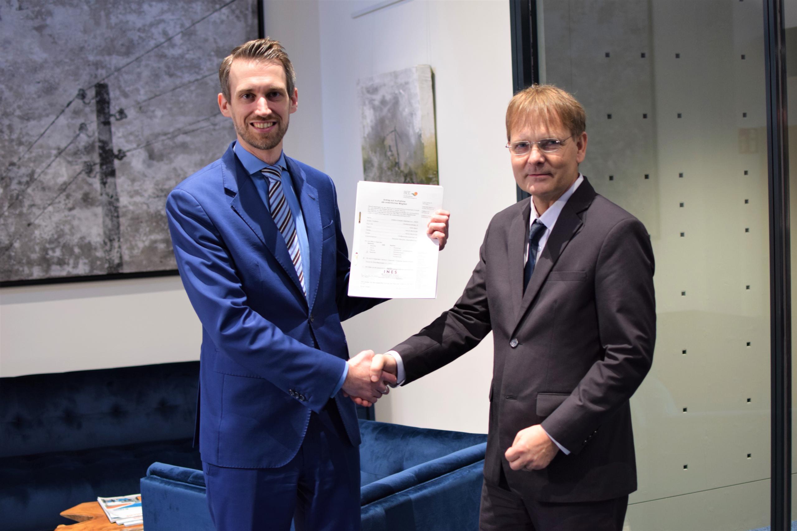 Beschreibung: Im Dezember 2022 trat die INES dem Bundesverband Erneuerbare Energie (BEE) bei. Auf dem Foto sind INES-Geschäftsführer Sebastian Bleschke und BEE-Geschäftsführer Wolfram Axthelm bei der Übergabe der Beitrittsdokumente.
