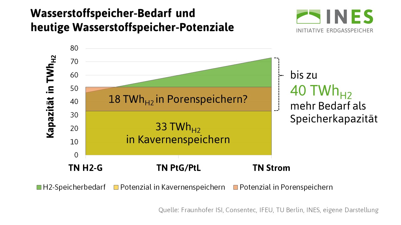 Technische Untersuchungen zeigen: Stellt man einen Gasspeicher von Erdgas auf Wasserstoff um, dann bleiben zunächst etwa 20 Prozent der energetischen Speicherfähigkeit erhalten. Damit könnten die gesamten aktuell in Deutschland installierten Gasspeicher mit einer Kapazität von etwa 255 Terawattstunden Erdgas nach Umstellung etwa 50 Terawattstunden Wasserstoff speichern. Allerdings muss davon ausgegangen werden, dass von den heutigen Porenspeichern mit etwa 90 Terawattstunden Kapazität voraussichtlich nur ein kleinerer Teil zur Speicherung von reinem Wasserstoff fähig sein wird.