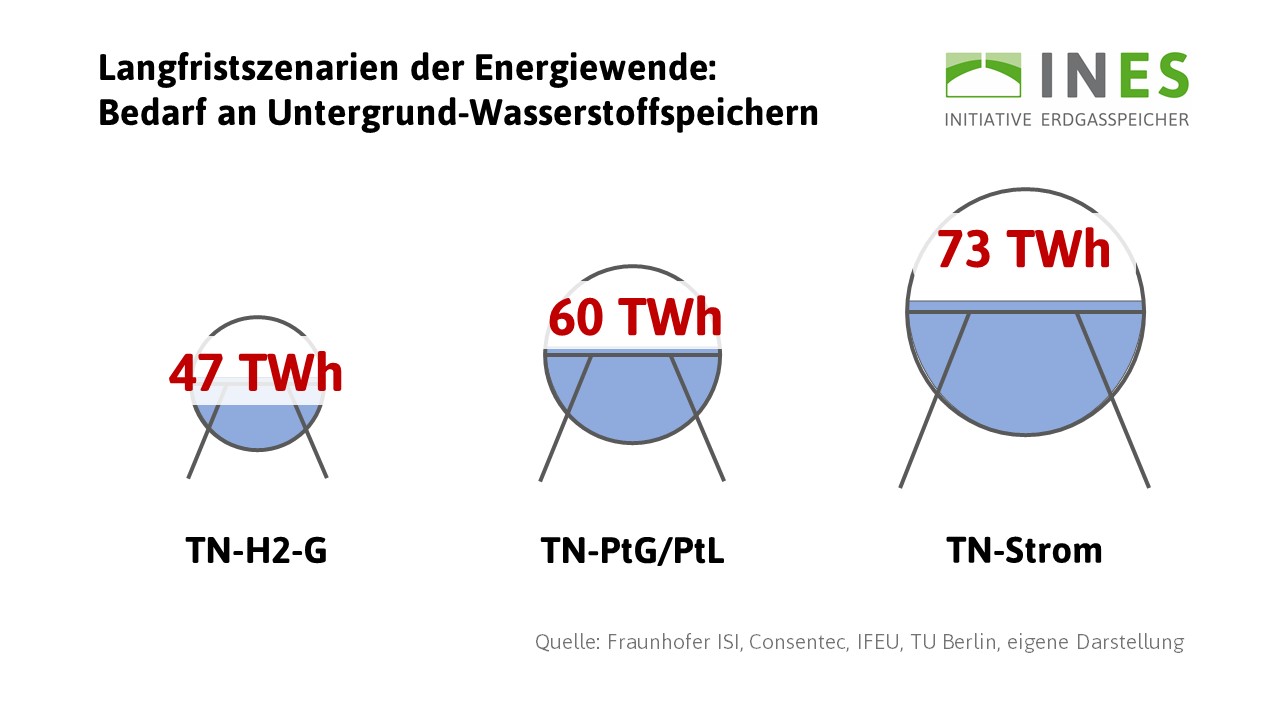 Die Betreiber von Gasspeichern und Wasserstoffspeichern verfolgen die Entwicklung der Langfristszenarien mit großem Interesse. Die Bundesregierung hat in den Langfristszenarien nämlich auch den zukünftigen Bedarf für Energiespeicher berechnen lassen. Das Ergebnis: Es ergibt sich ein Bedarf an unterirdischen Wasserstoff-Speichern von 47 bis 73 Terawattstunden.