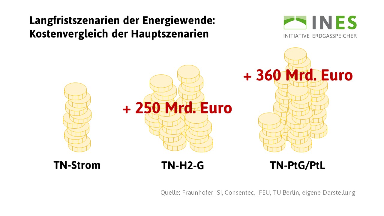 Die Langfristszenarien der Energiewende kommen zu dem Schluss: Die volkswirtschaftlichen Kosten sind für eine starke Elektrifizierung des Energiesystems am niedrigsten. Das Szenario TN-Strom ist demnach rund 250 Milliarden Euro günstiger als das TN-H2-G-Szenario. Das TN-PtG/PtL-Szenario schneidet sogar rund 360 Milliarden Euro teurer ab.